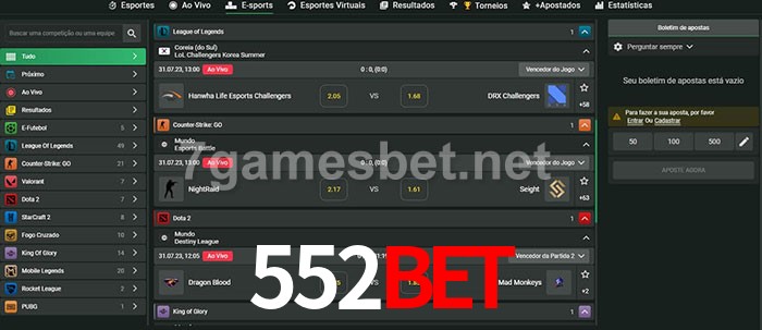 O 552Bet oferece uma grande seleção de opções de apostas em e-sports com probabilidades competitivas
